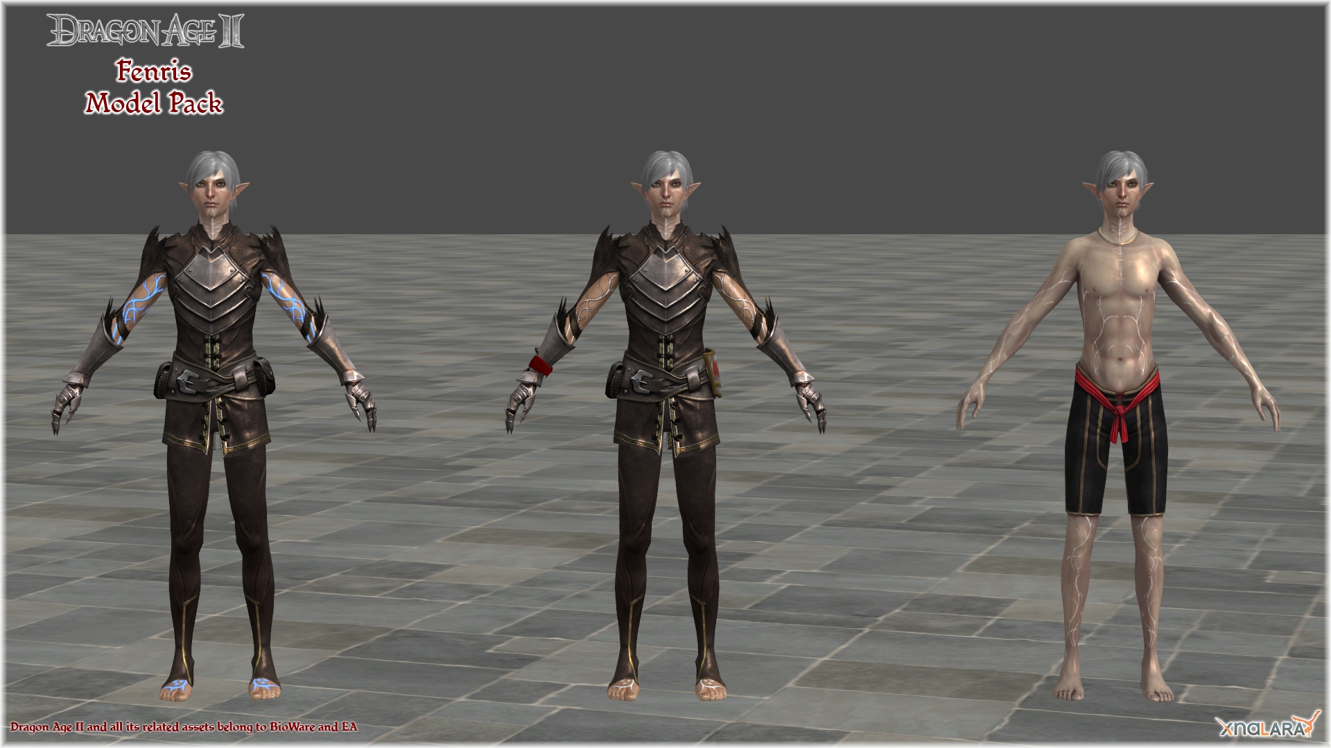 Description: A group of three different poses of a man in armor and a woman in a dress with a red ribbon.