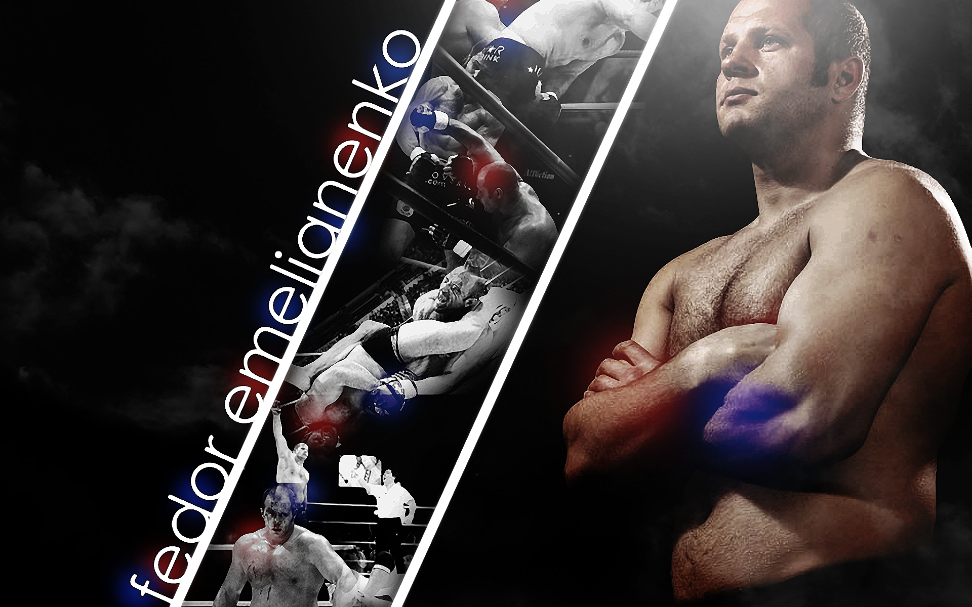 Description: A man with his arms crossed standing in front of a poster of a wrestler and a fighter on a black background.