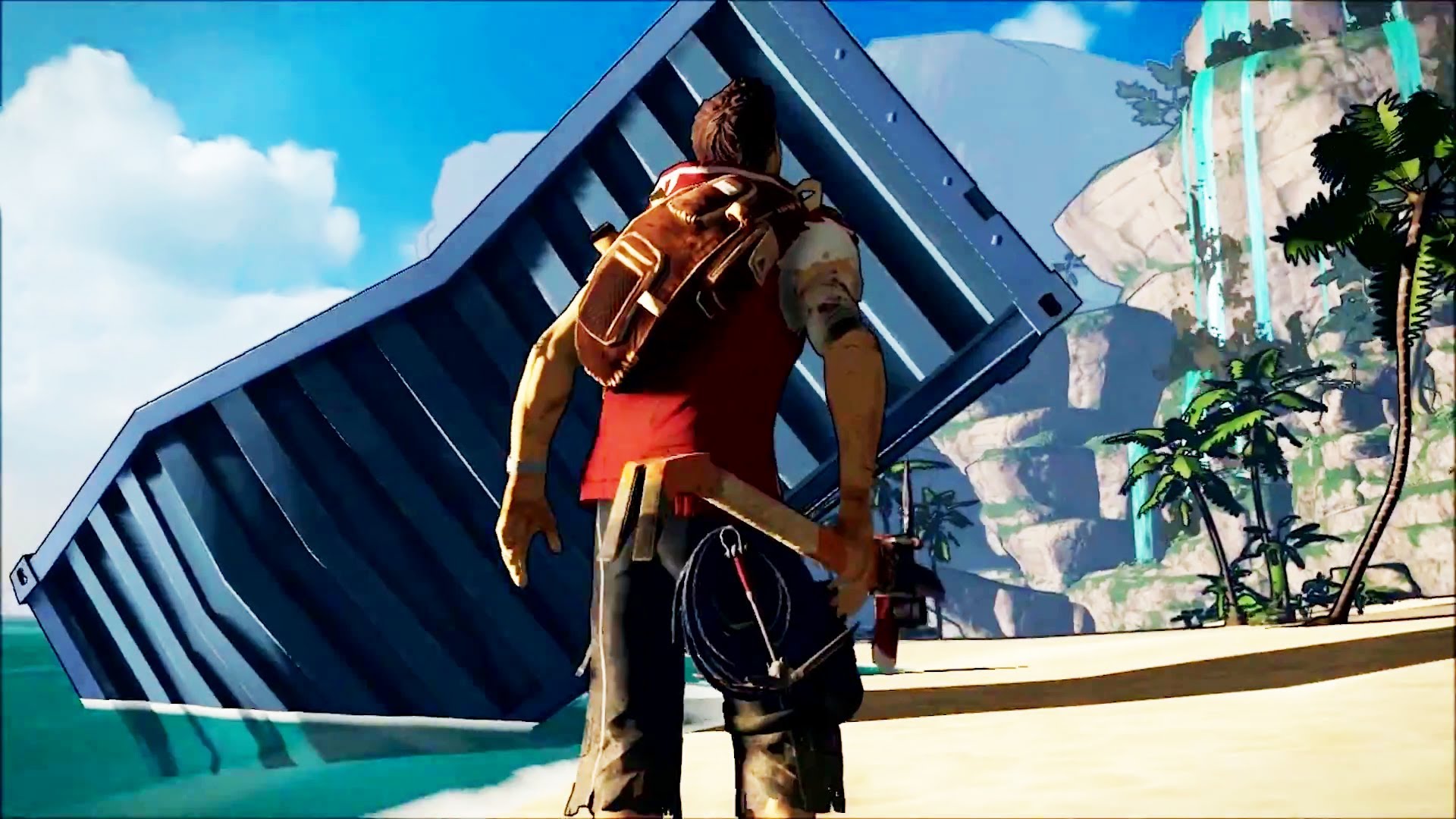 Description: A man with a backpack and a skateboard in a video game scene with a giant building in the background.