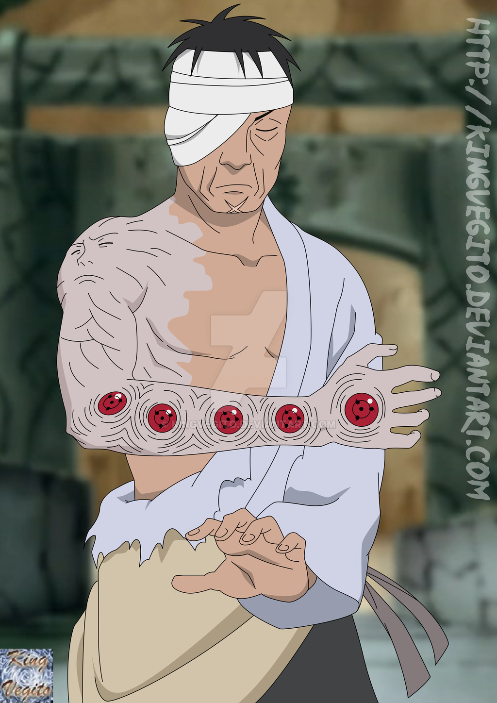 Description: A man with a bandage around his head holding a red eyeball in his hand and a white headband around his neck.