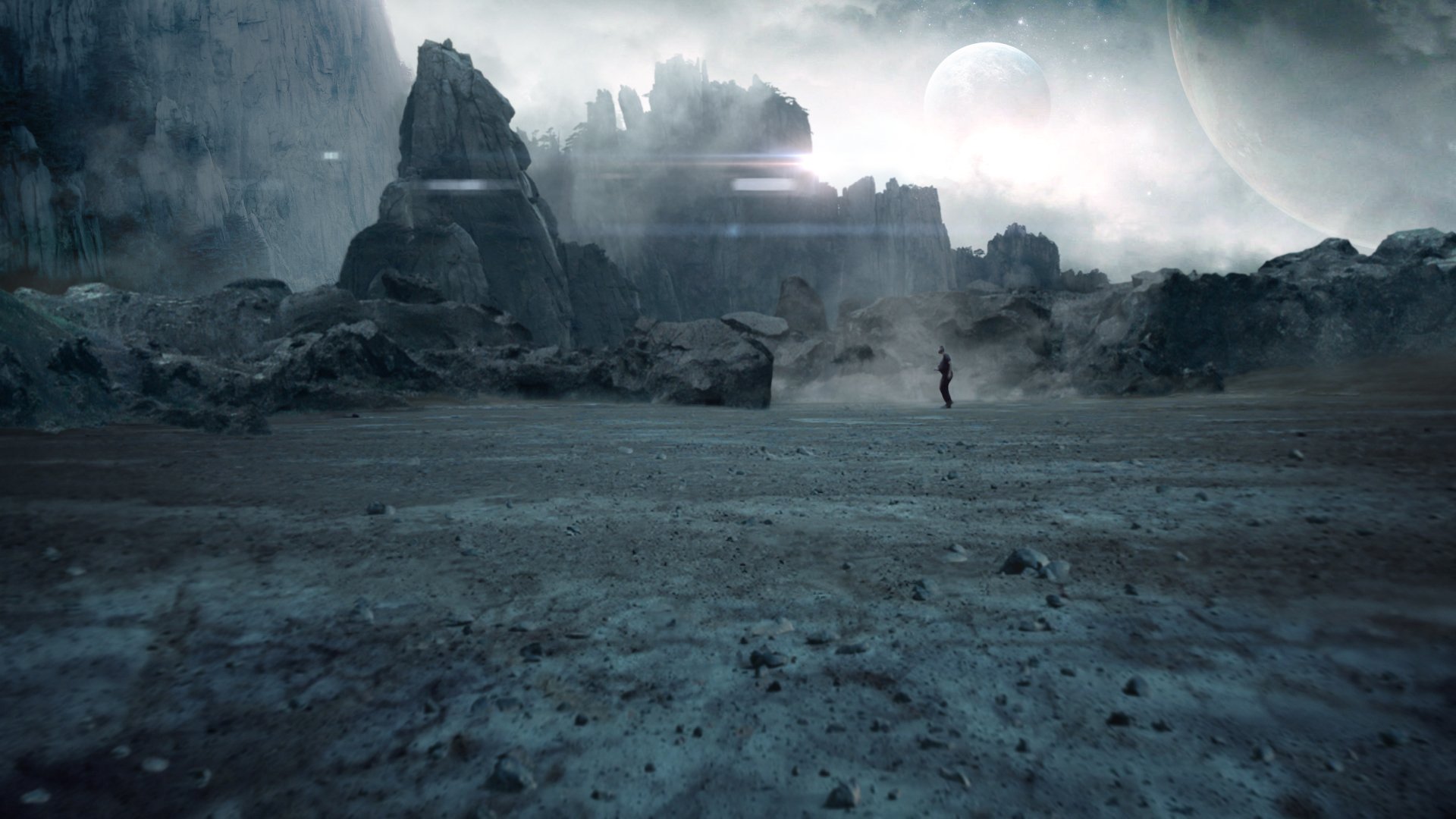 Description: A man standing in a barren area with rocks and a mountain in the background with a distant sky and a distant planet.