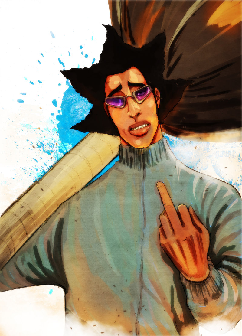 Description: A man with a baseball bat and a hat on his head is pointing to the side of his head.