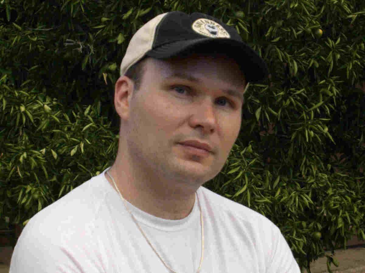 Description: A man in a baseball cap is posing for a picture in front of a bush with a tennis racket.