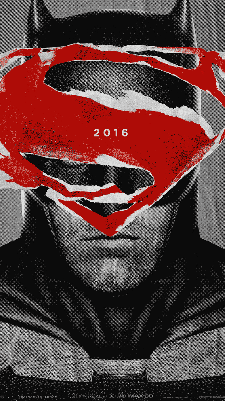 Description: A man with a batman mask on his face and a red superman symbol on his chest.