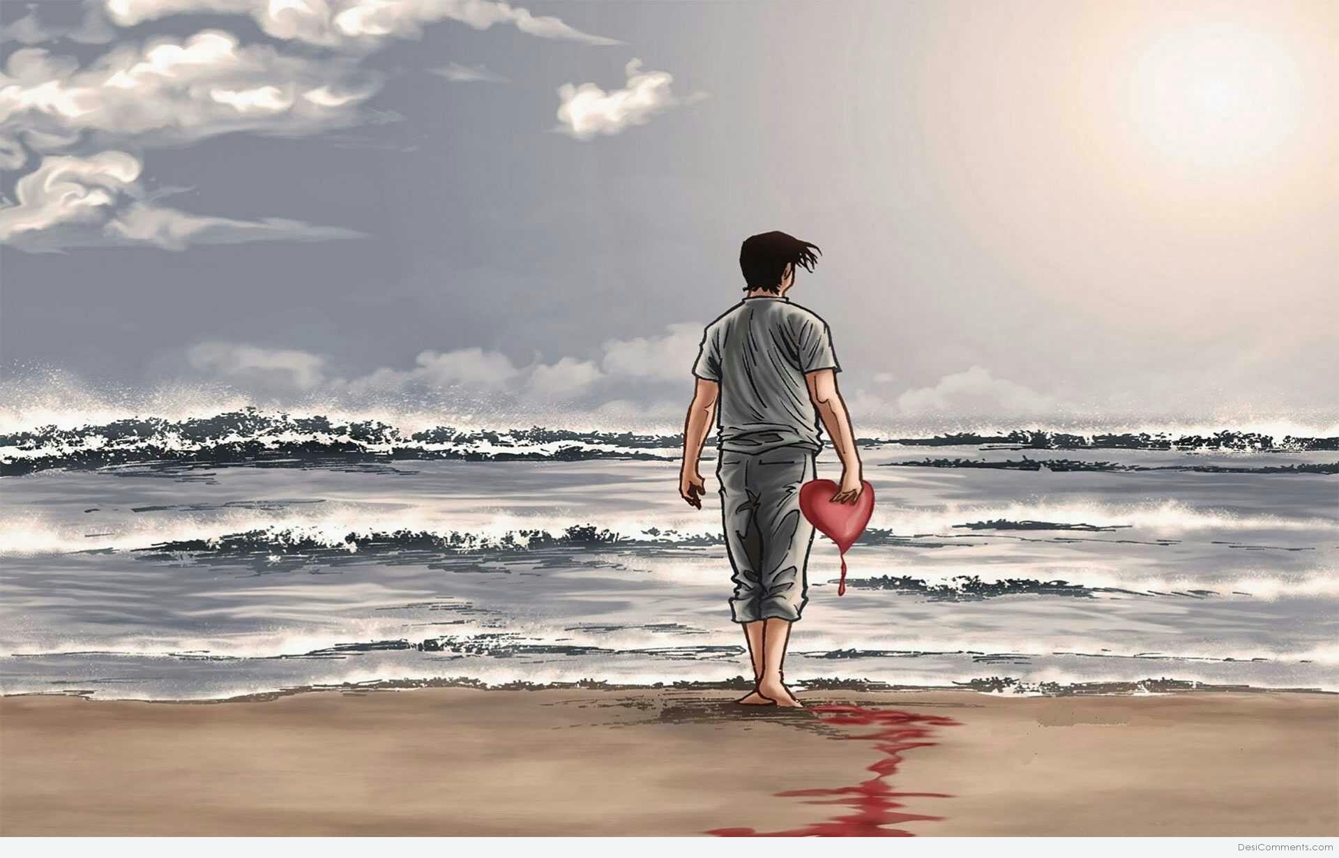 Description: A man standing on a beach next to the ocean with a heart shaped object in his hand and a sky with clouds.