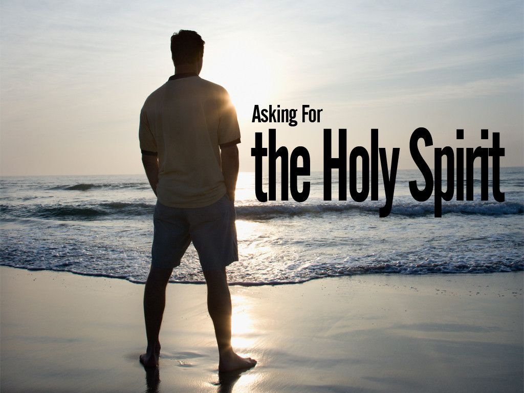 Description: A man standing on a beach next to the ocean with the words asking for the holy spirit above him.