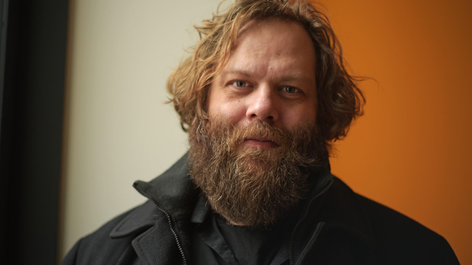 Description: A man with a beard and a black jacket looking at the camera with a serious look on his face.