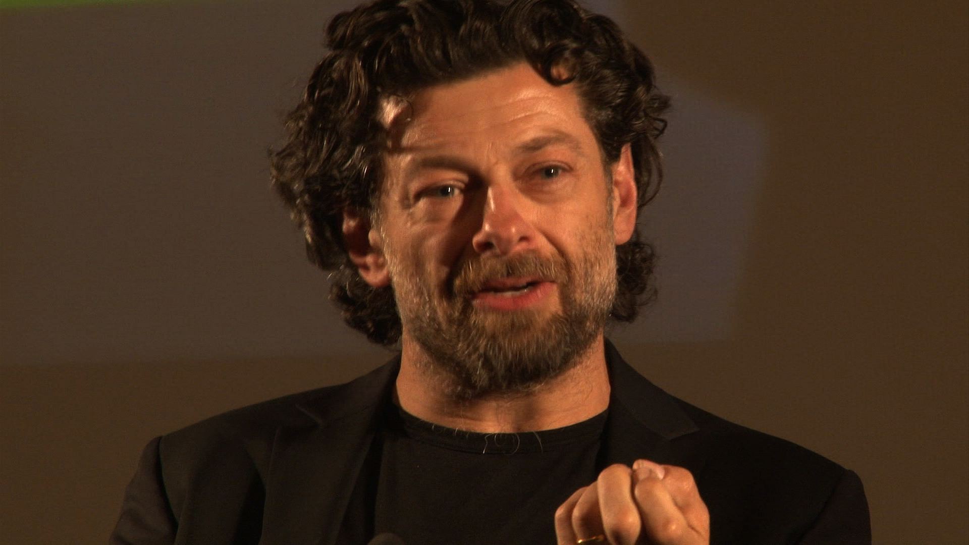Description: A man with a beard and a black shirt is speaking into a microphone and a green light is behind him.