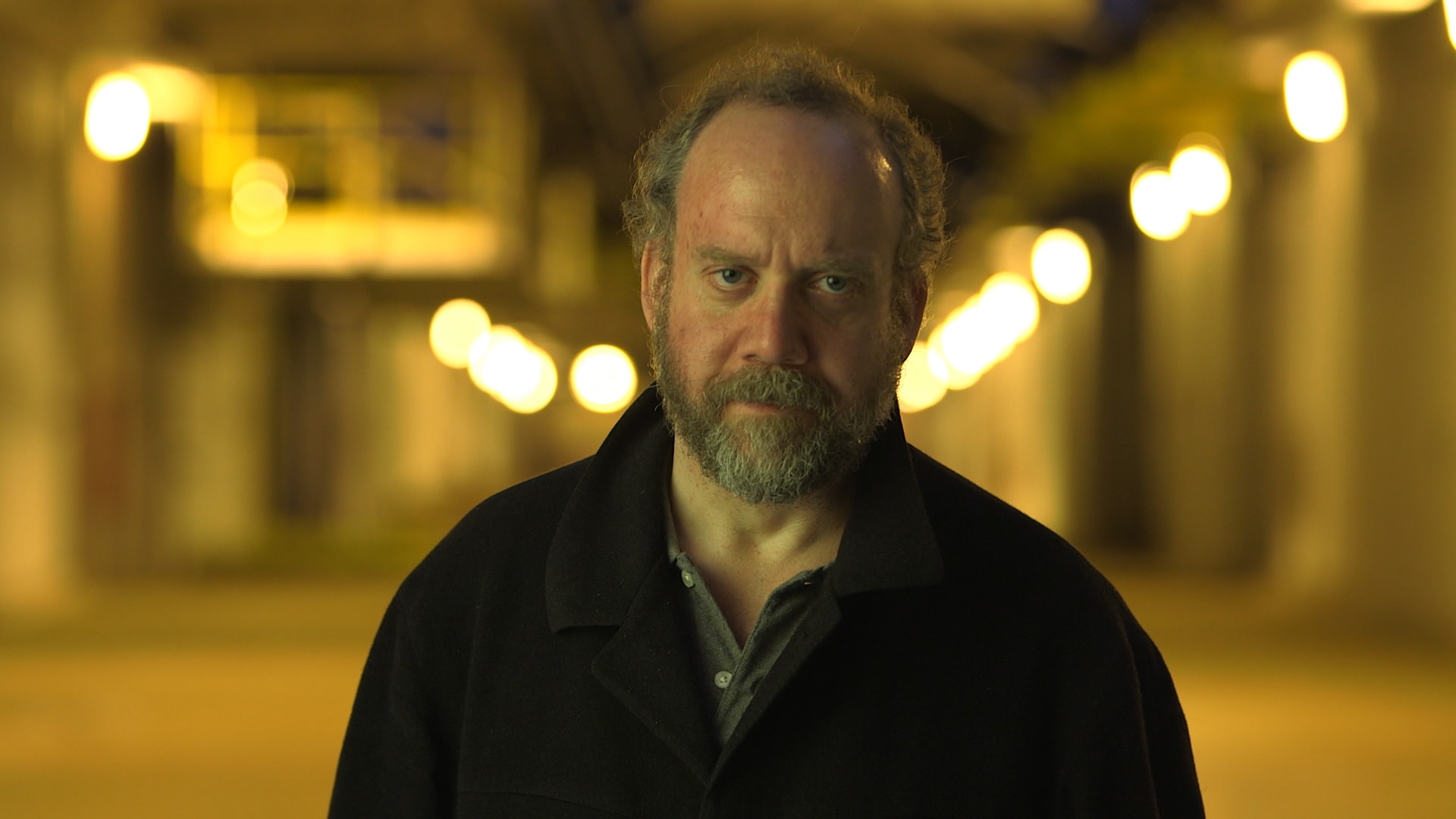 Description: A man with a beard and a black shirt is standing in a tunnel with lights on the ceiling and a black shirt is on.
