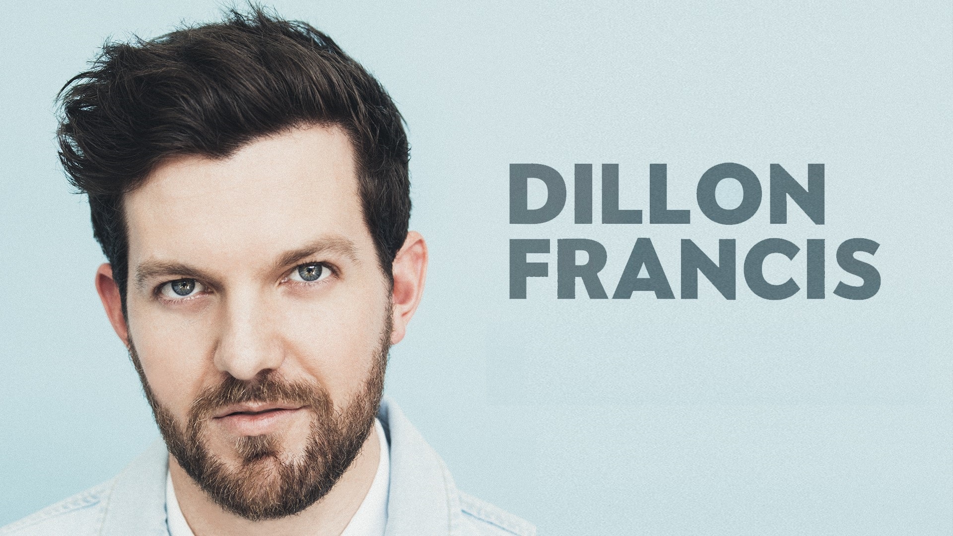 Description: A man with a beard and a blue shirt is looking at the camera with the words dilllon franois.