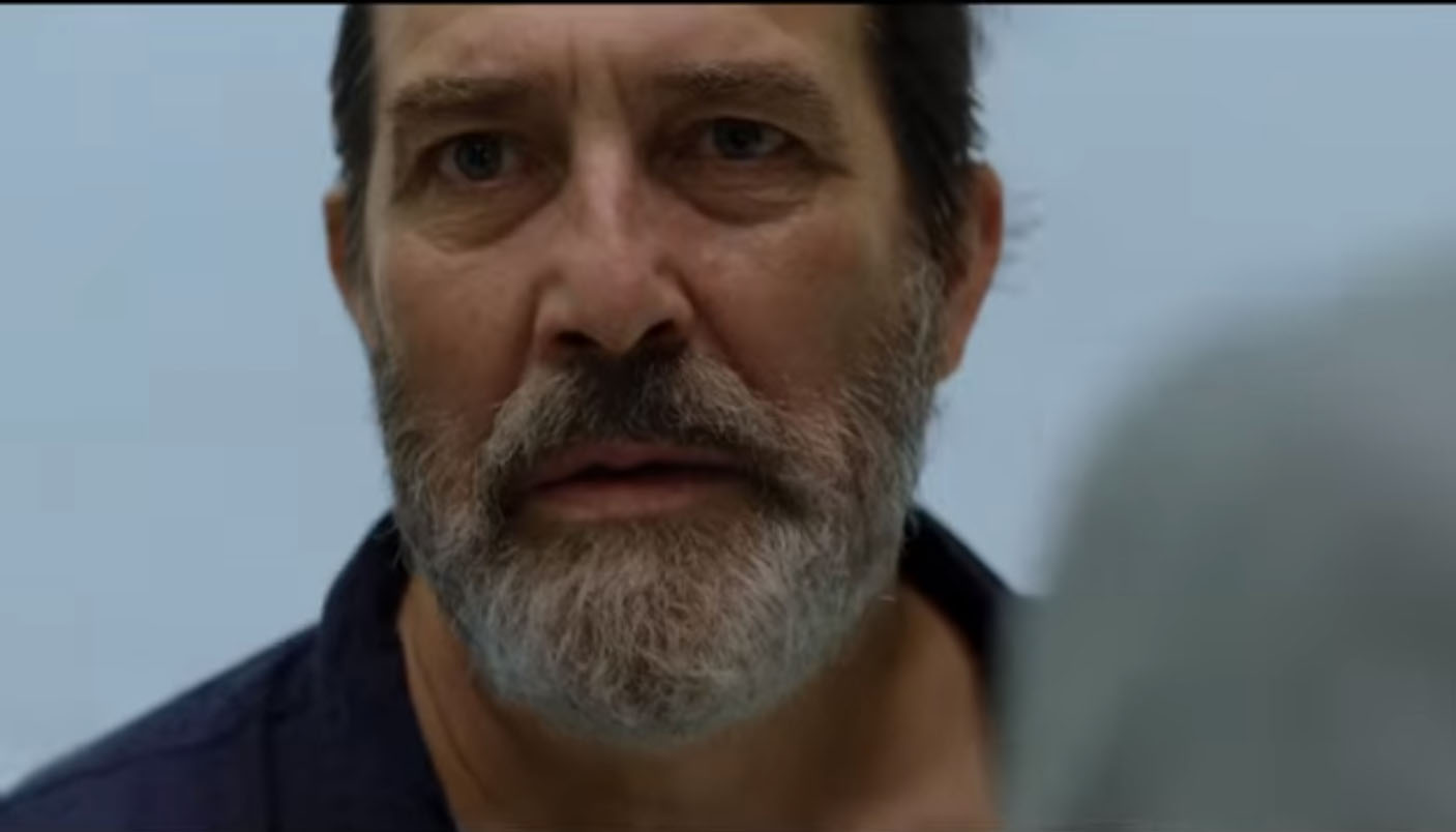 Description: A man with a beard and a blue shirt looking at something in the mirror with a blurry background.