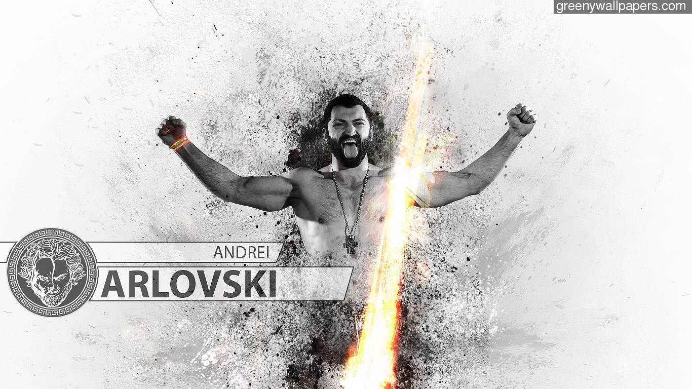 Description: A man with a beard and a beard standing in front of a fire and smoke background with his arms in the air.