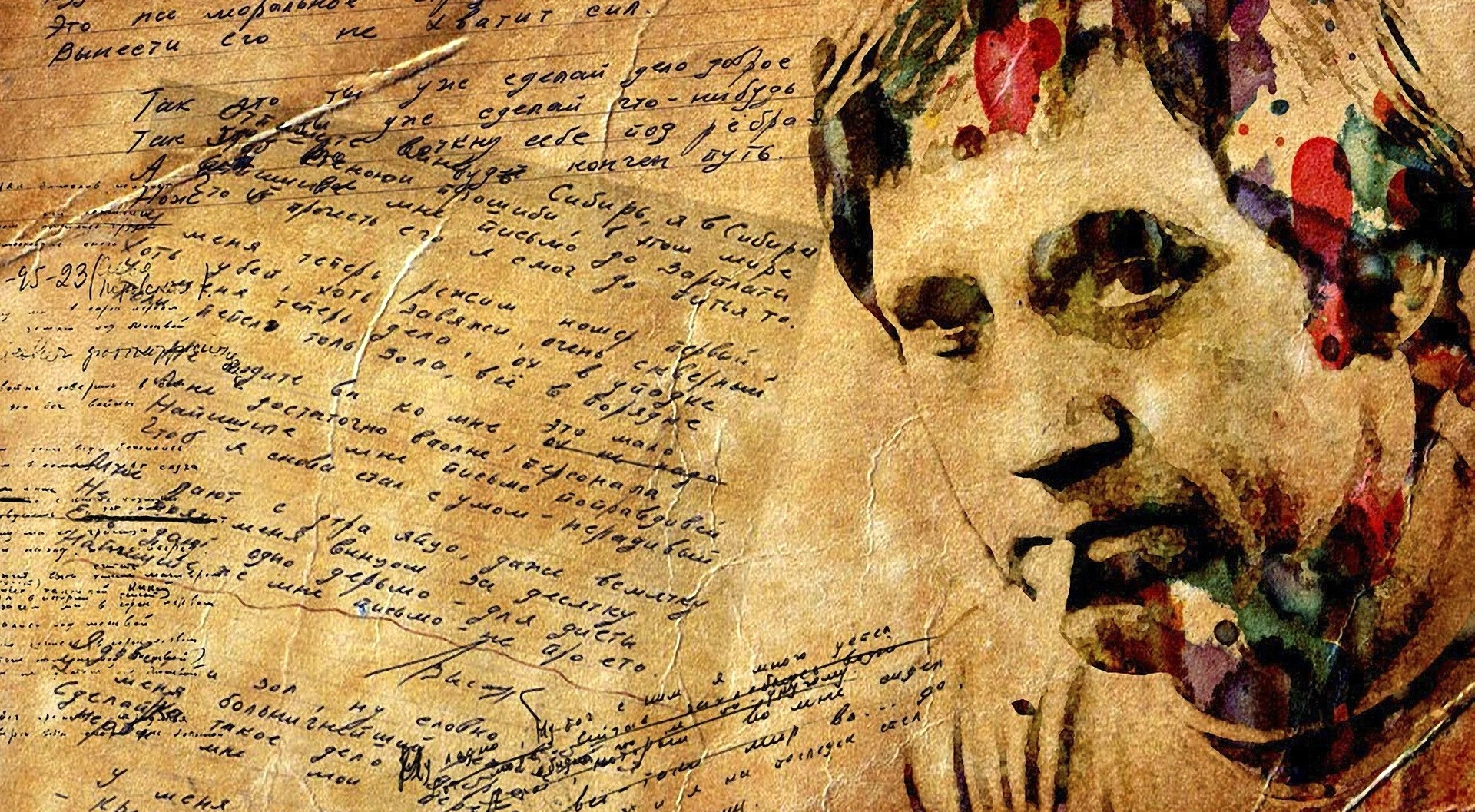 Description: A painting of a man with a beard and flowers on his head and handwritten letters on the paper.