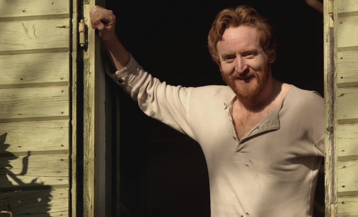 Description: A man with a beard and glasses standing in a doorway of a building with his arms up in the air.