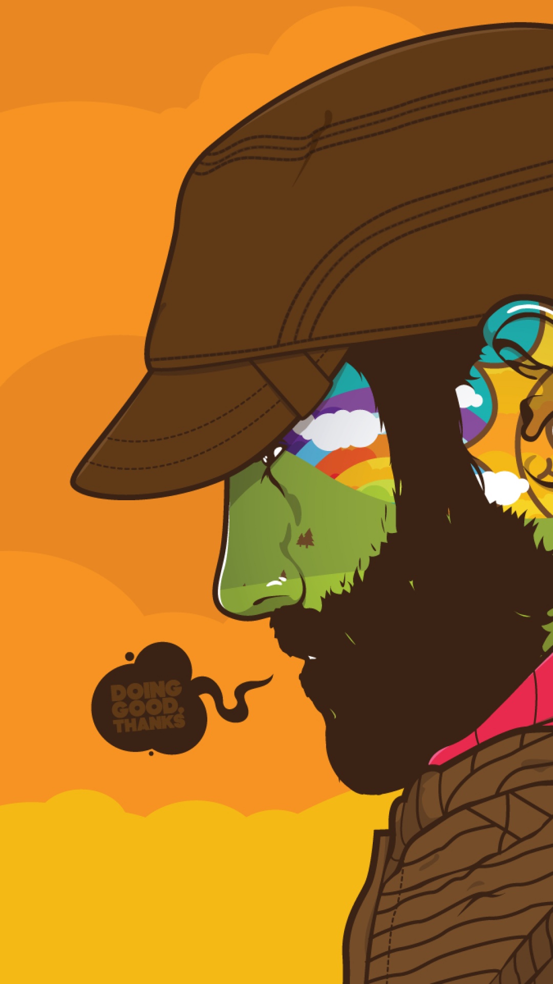Description: A man with a beard and a hat on his head with a pipe in his mouth and a rainbow colored background.