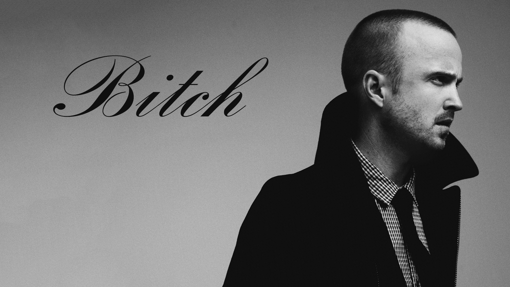 Description: A man with a beard and a jacket on is looking at the camera with a name written on it.