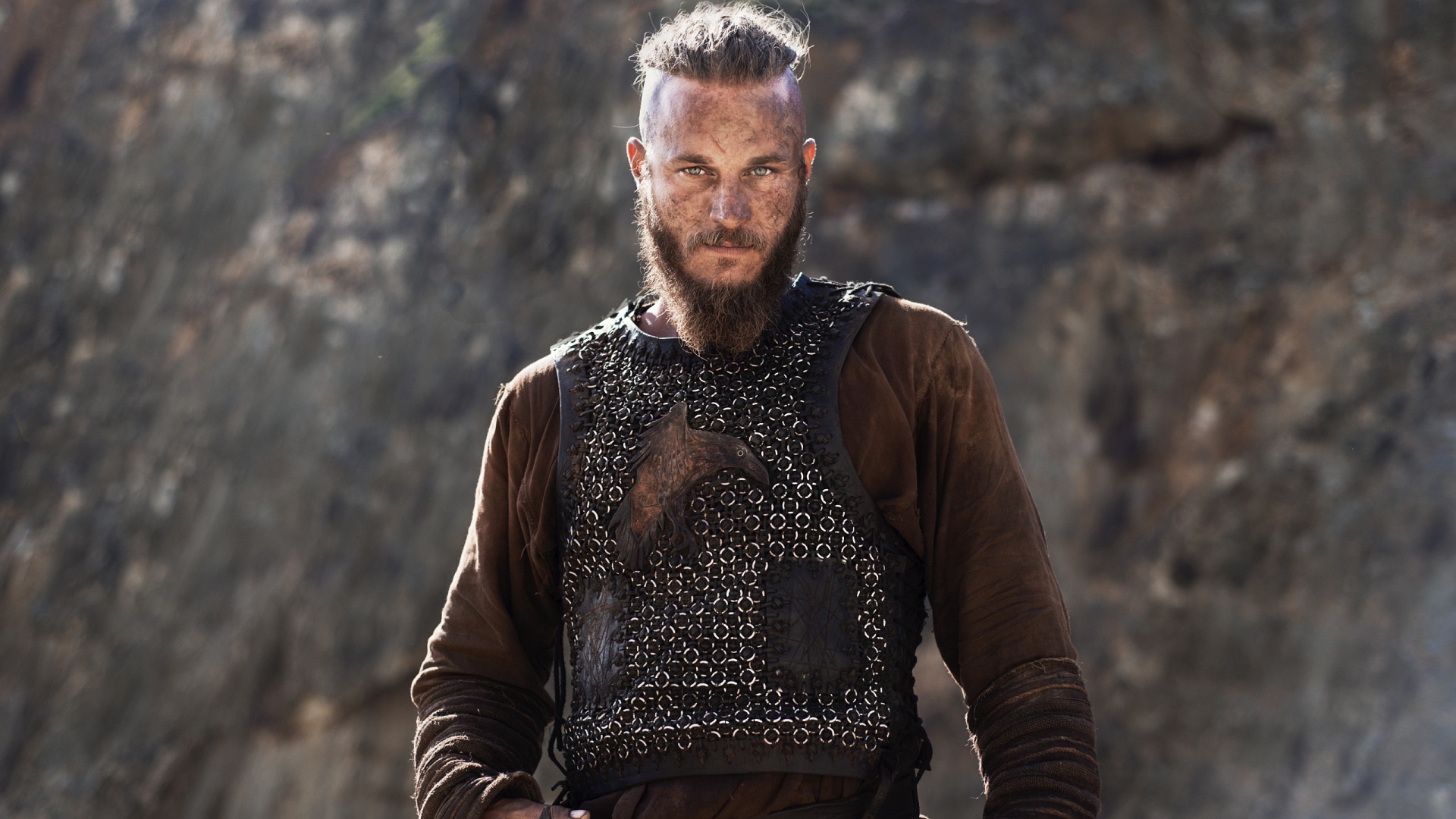 Description: A man with a beard and a leather jacket on standing in front of a rock formation with a rock face.