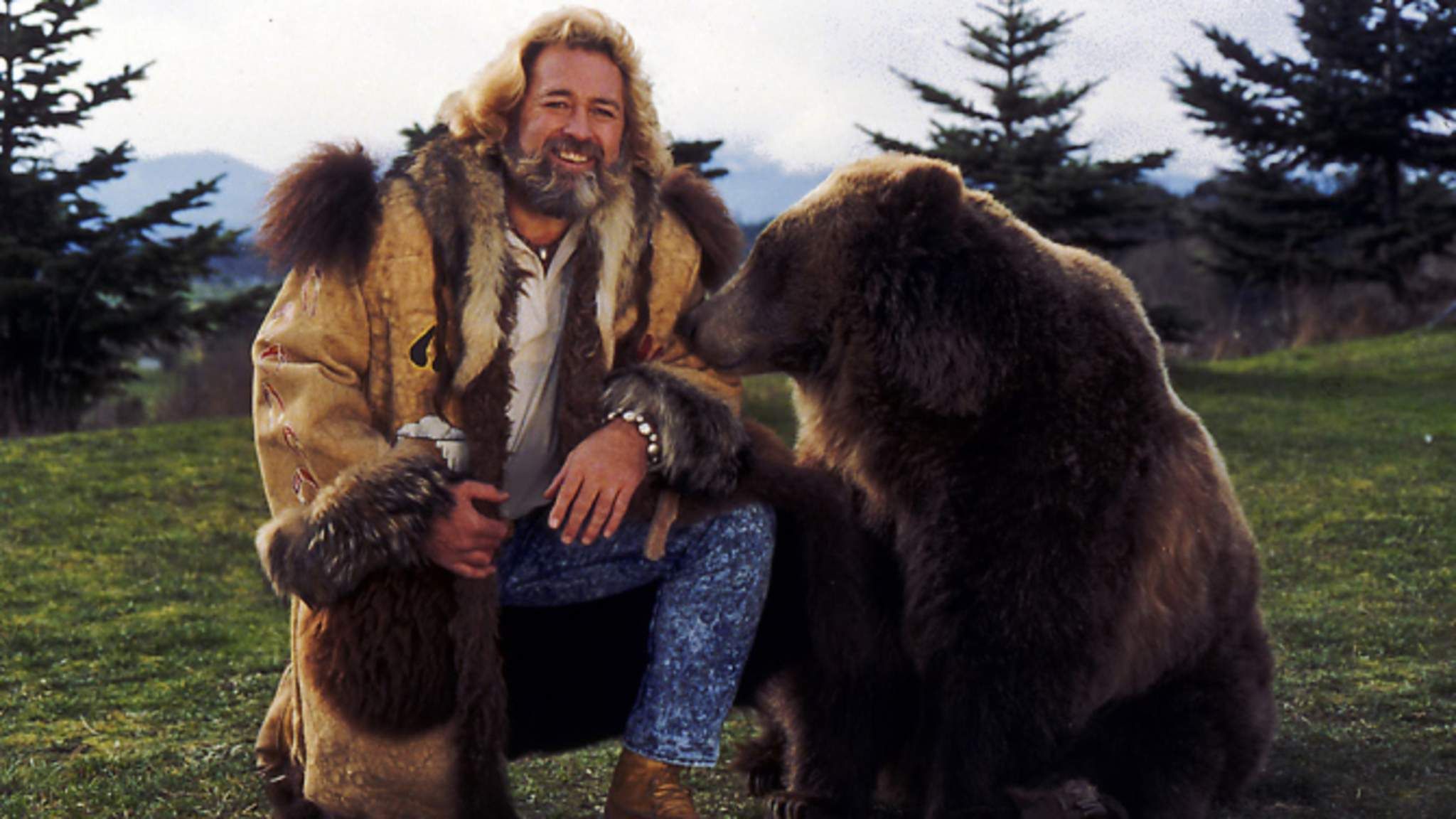Description: A man sitting next to two bears in a field of grass and trees with mountains in the background and a sky.