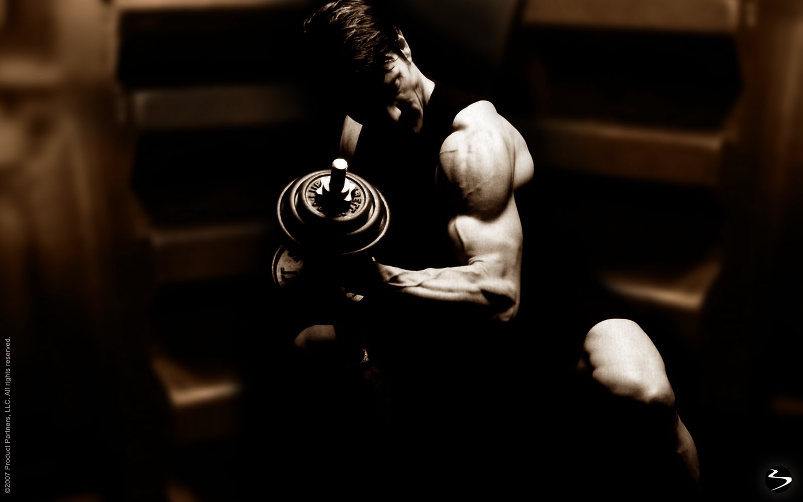 Description: A man sitting on a bench holding a dumbble barbell in his hands and looking down at his chest.