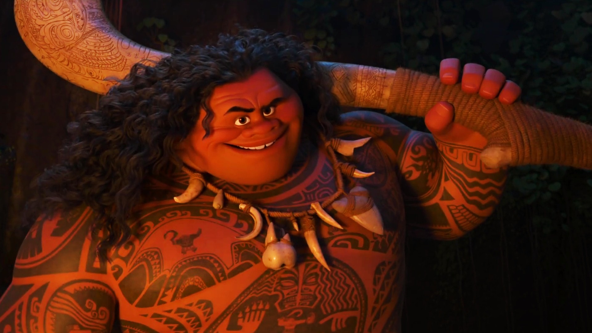 Description: A man with a big smile and a big horned head holding a large stick in his hand and a big smile on his face.