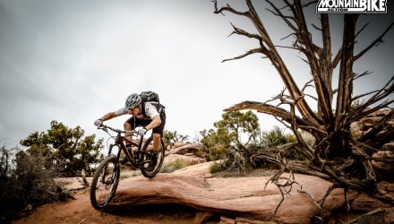 Description: A man riding a bike down a dirt road next to a tree and rocks with a cloudy sky in the background.