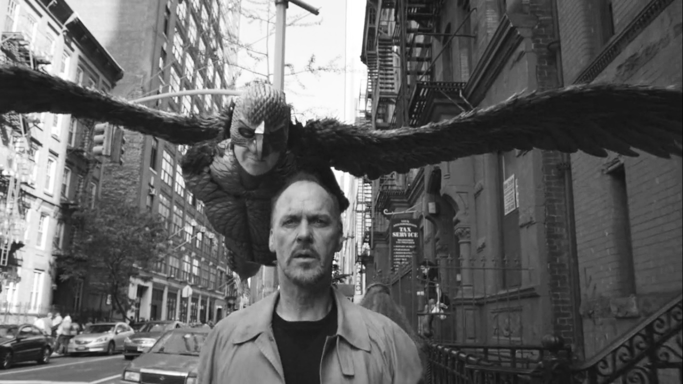 Description: A man standing in front of a large bird on his head and a woman on his shoulders with a bird on his shoulder.