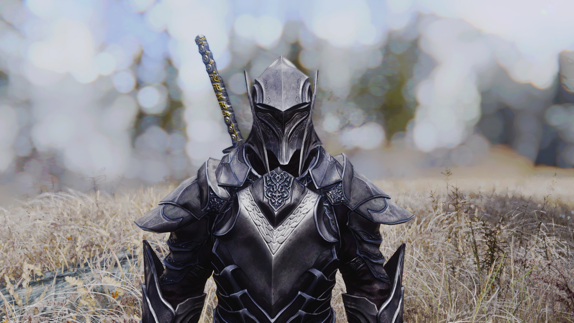 Description: A man in a black armor with a sword in his hand in a field of tall grass with trees in the background.