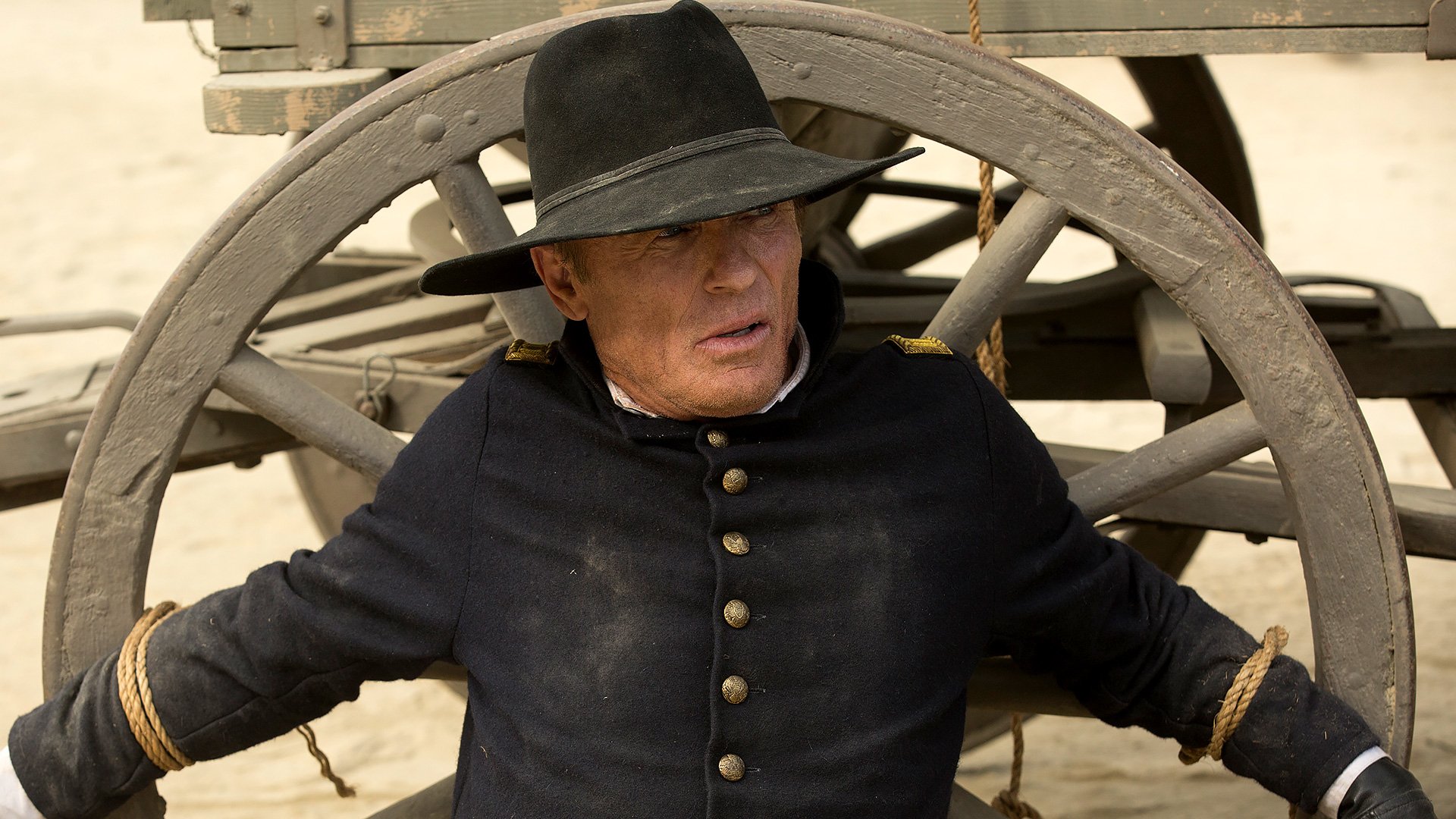 Description: A man in a black coat and hat sitting on a bench with a wheel behind him and a bench behind him.