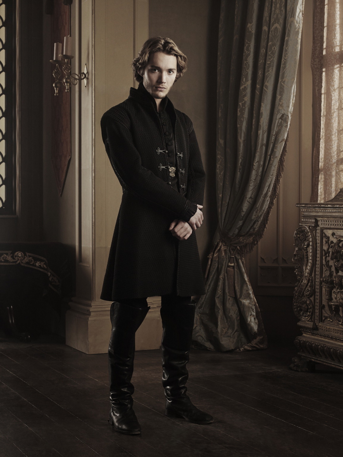 Description: A man in a black coat standing in a room with a window and a curtain behind him and a wooden floor.