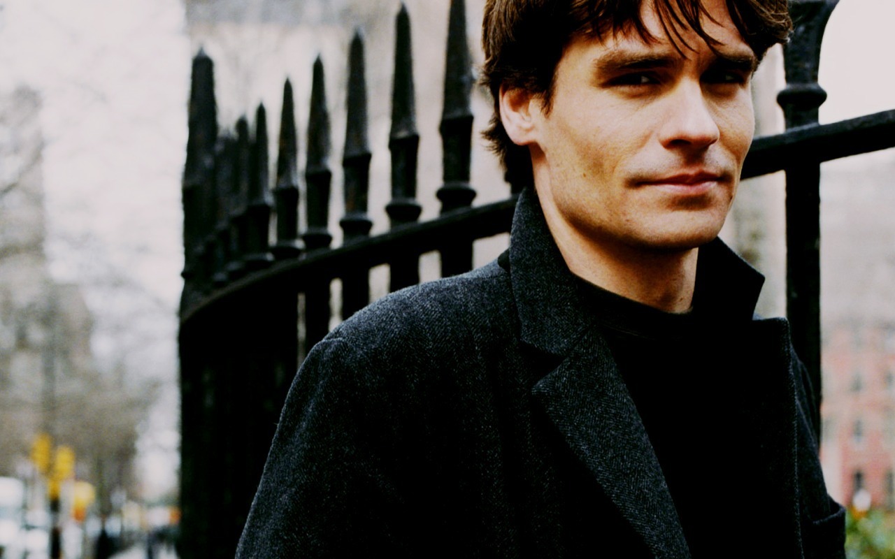 Description: A man standing in front of a black fence and a building with a clock on it's side.