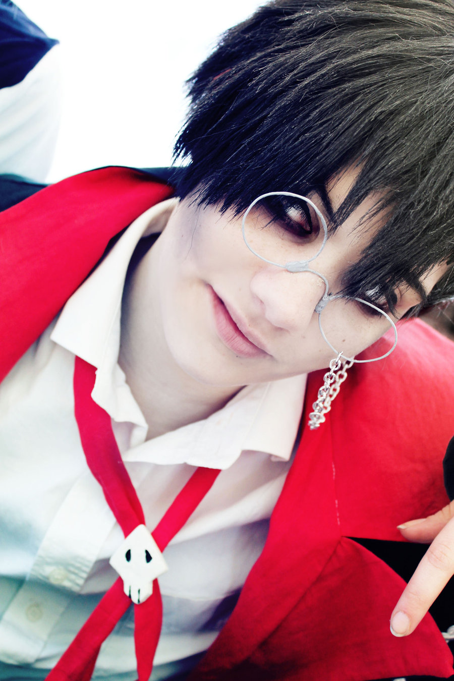 Description: A man with black hair and glasses pointing at the camera with a finger up in front of him and wearing a red jacket.