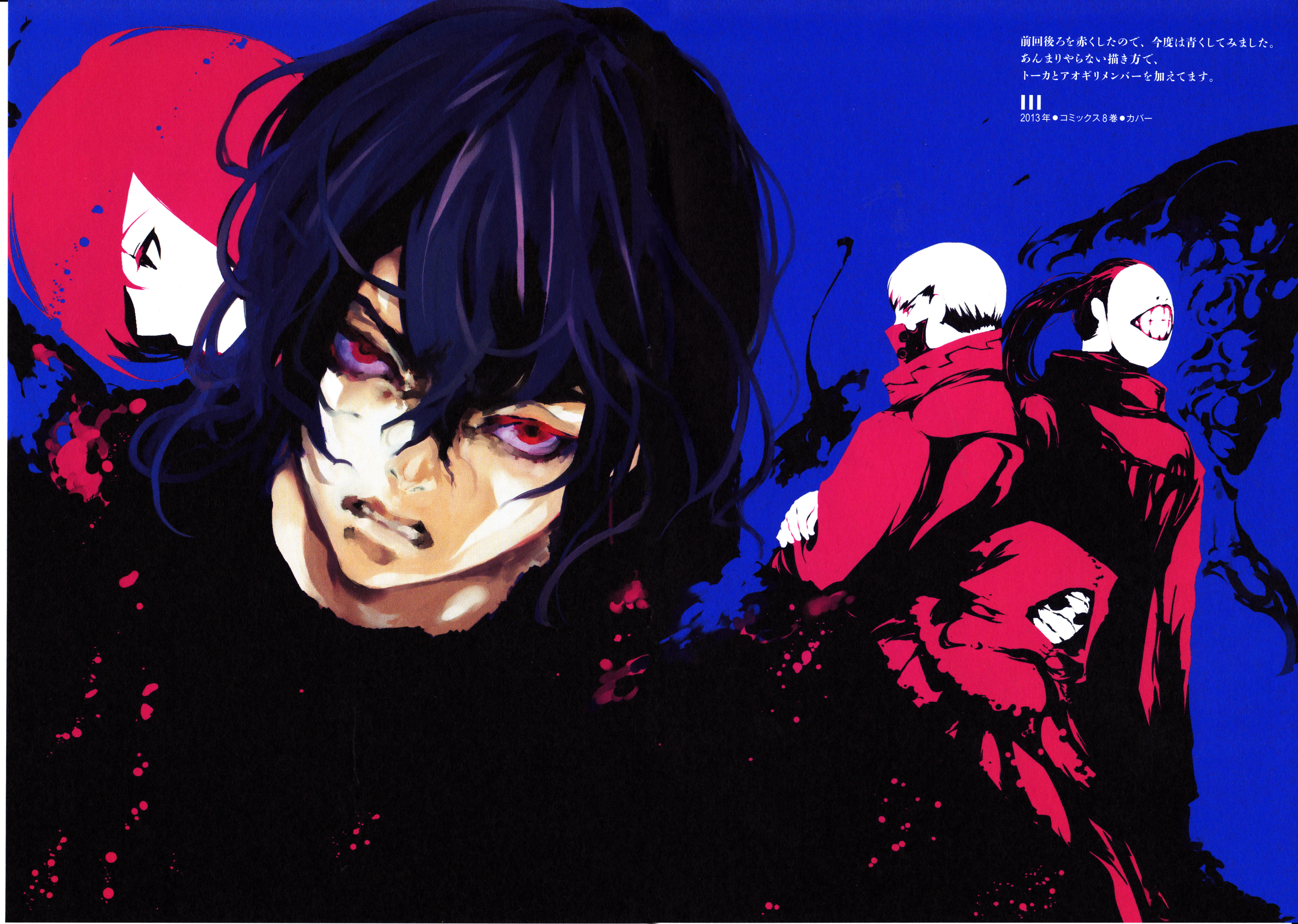 Description: A painting of a man with black hair and red eyes and a red skull on his head and a blue background.