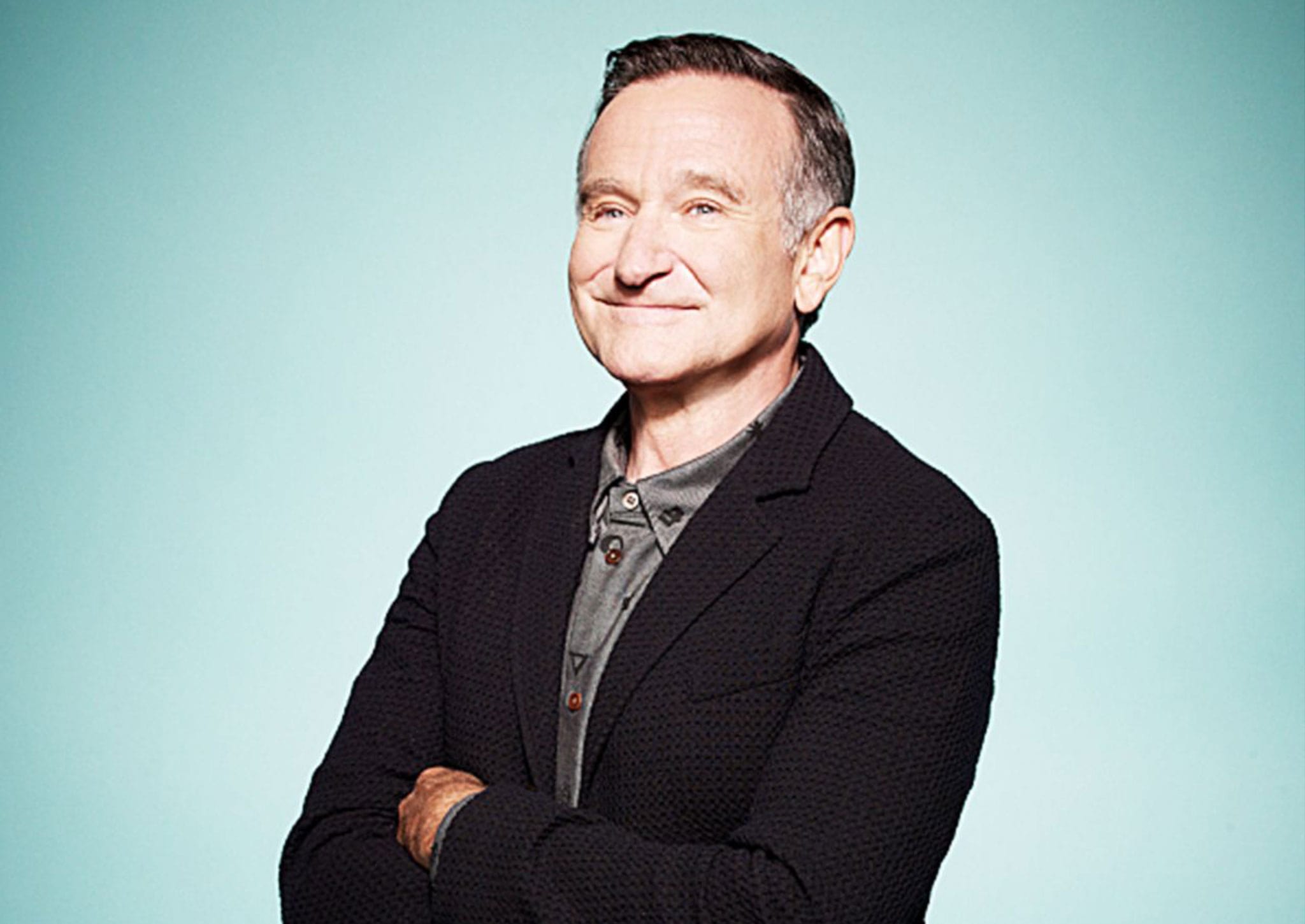 Description: A man in a black jacket and a blue background with his arms crossed and his arms crossed.