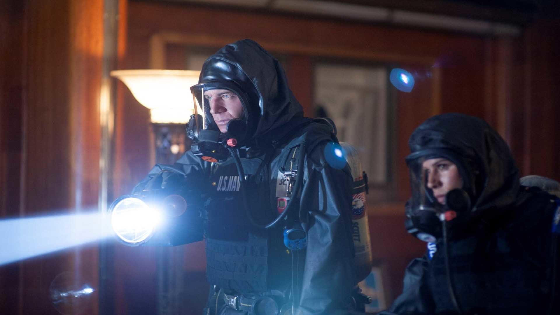 Description: A man in a black jacket holding a flashlight in his hand and a man in a black jacket with a hood on.