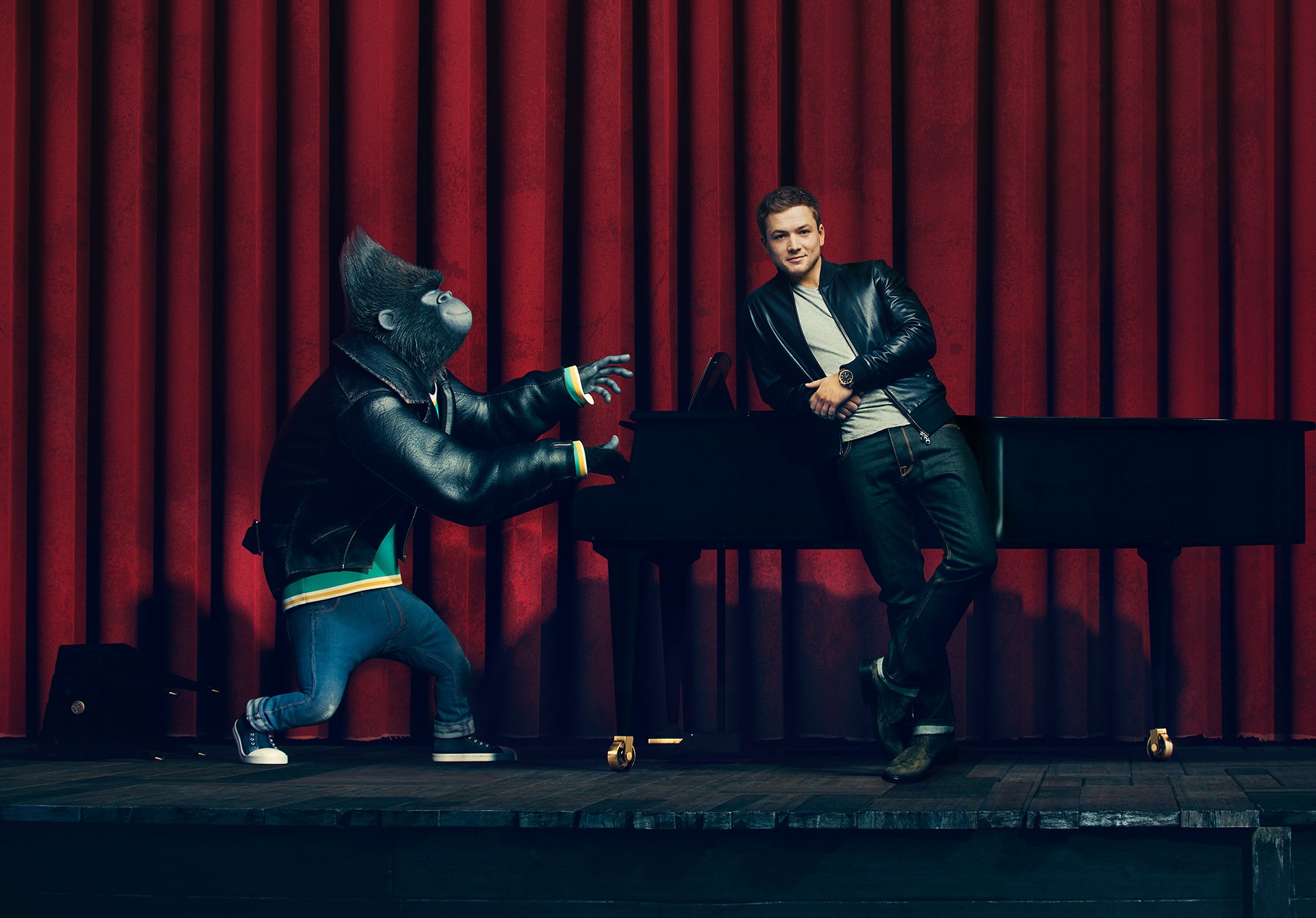 Description: A man in a black jacket and a man in a black suit and a gorilla mask are standing on a stage.