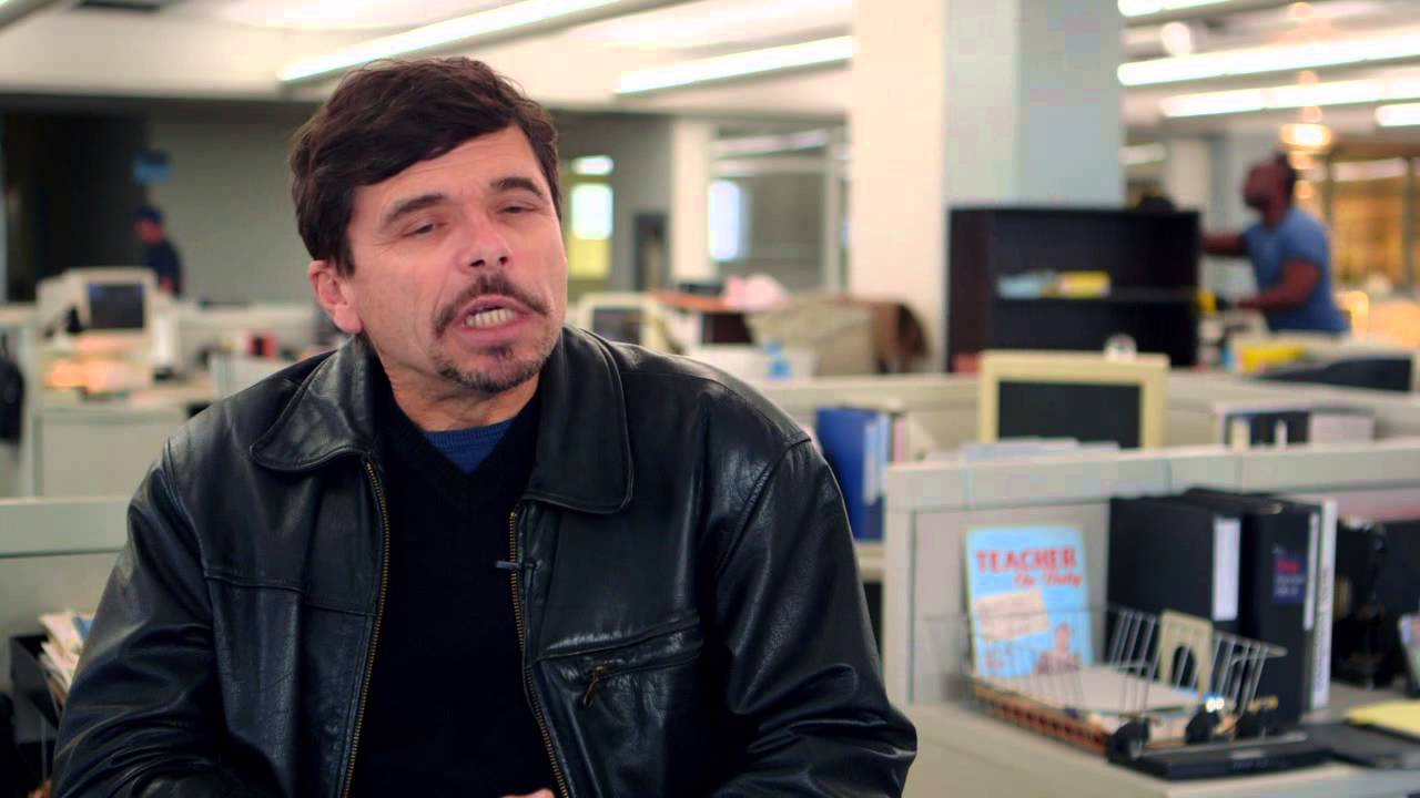 Description: A man in a black jacket is sitting in an office cubicle with a surprised look on his face.
