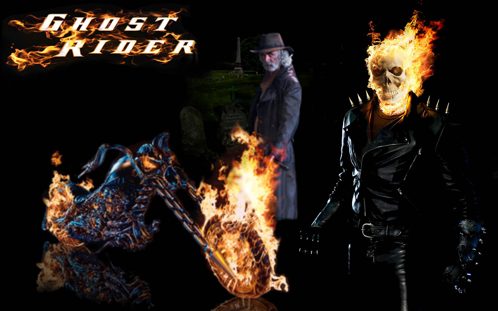 Description: A man in a black leather outfit and a fire demon on a motorcycle with a man in a black hat.