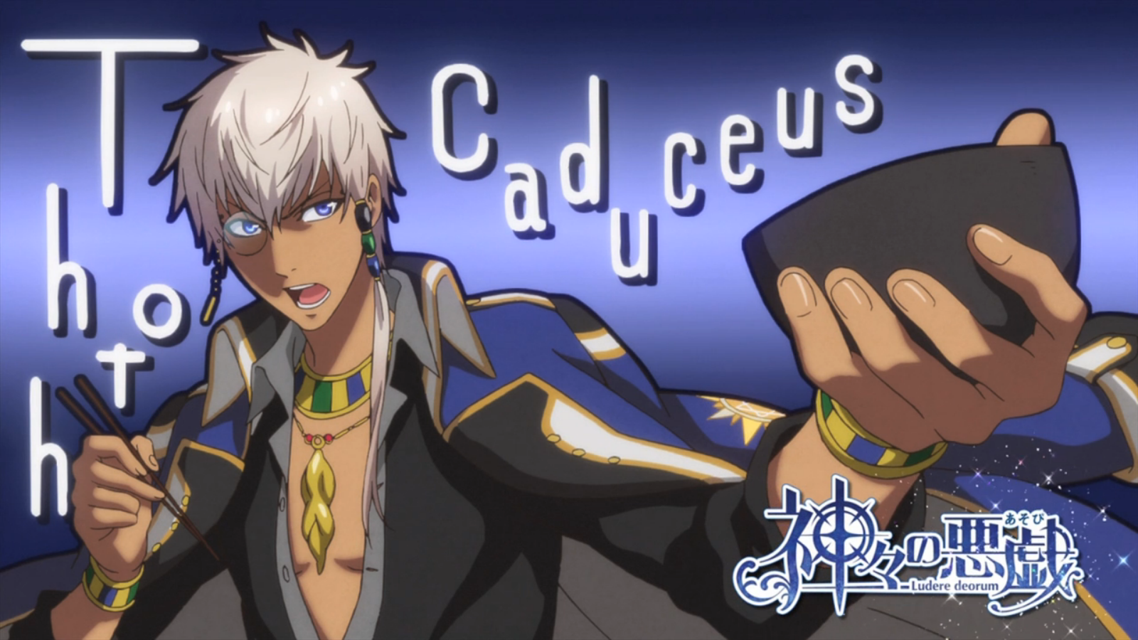 Description: A man in a black outfit holding a black object in his hand and a blue background with the words.