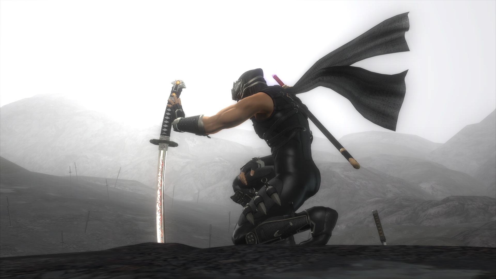 Description: A man in a black outfit holding a sword and a flag in his hand and a black cape on his head.