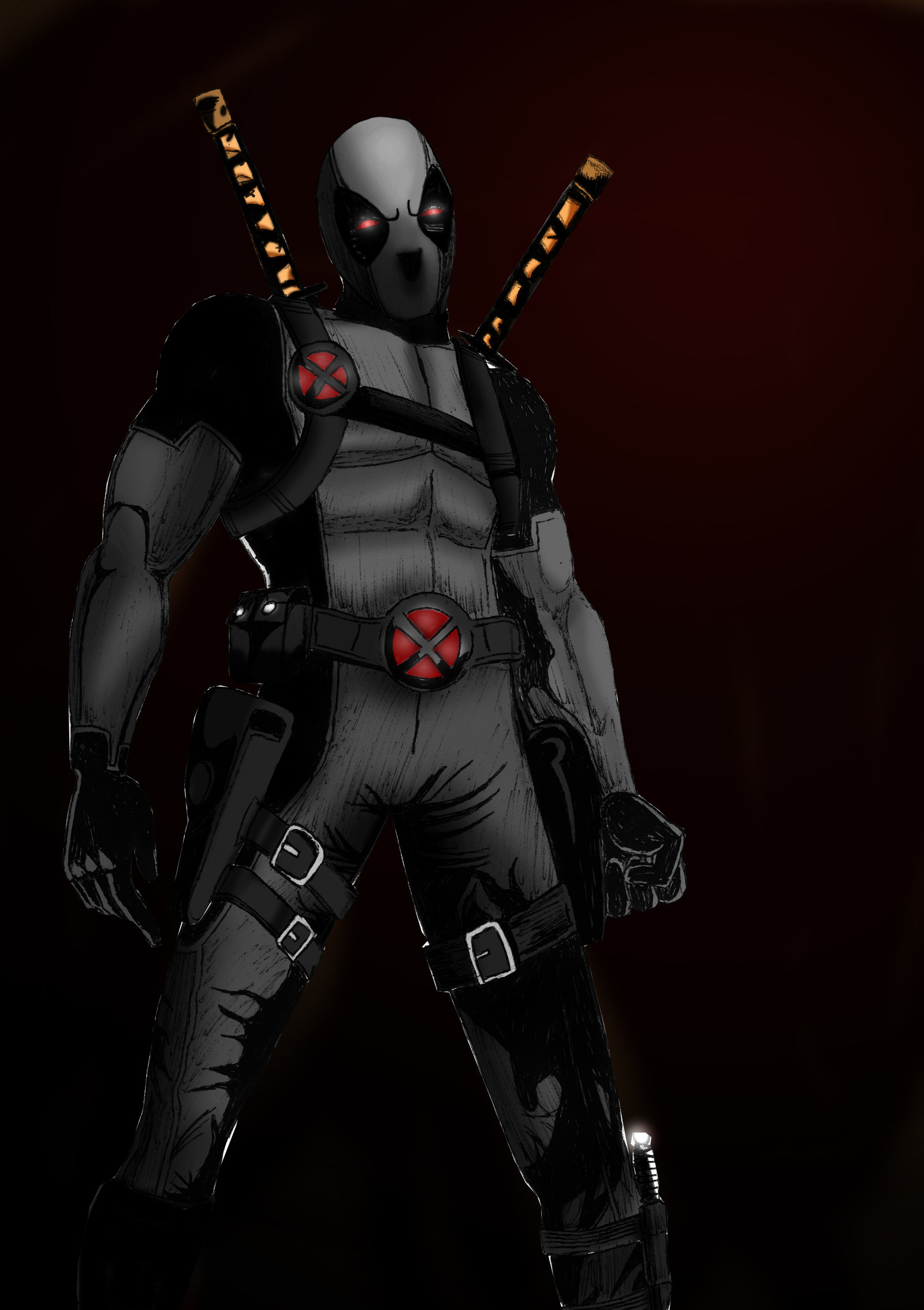 Description: A man in a black and red costume holding two swords and a gun in his hand.