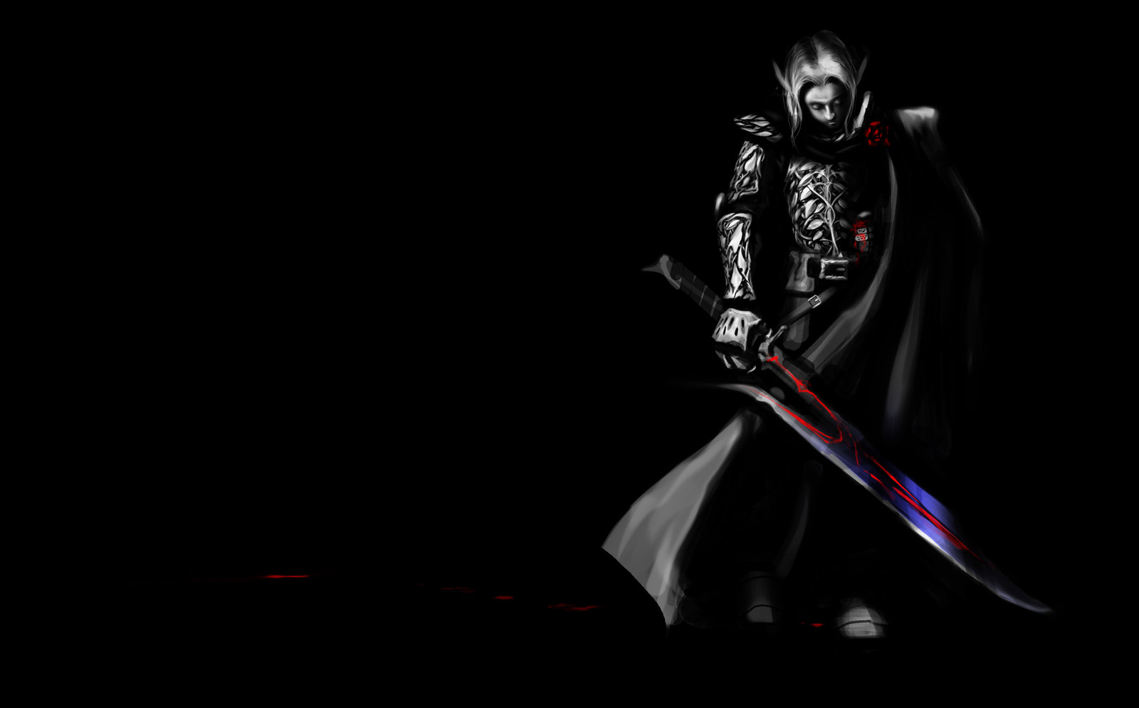 Description: A man in a black robe holding a sword in his hand and a skull on his arm and a skull on his shoulder.