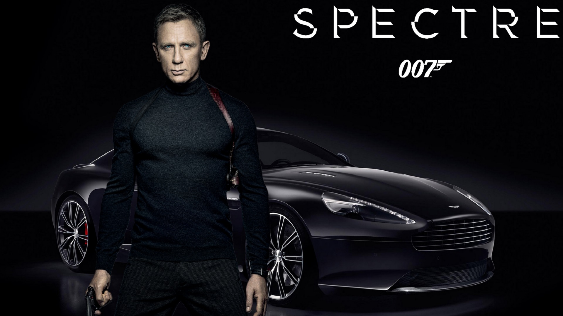 Description: A man in a black shirt and black pants standing next to a black car with the words spectre on it.