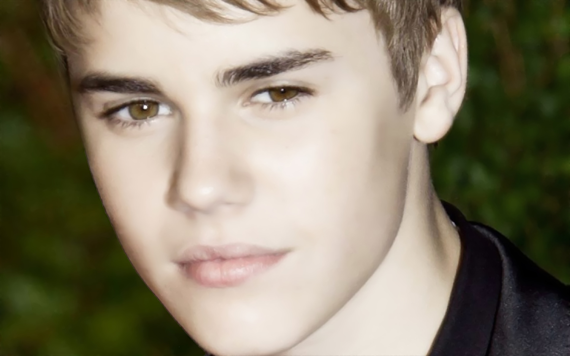 Description: A man with a black shirt and a black shirt on and a green background with a bush behind him.
