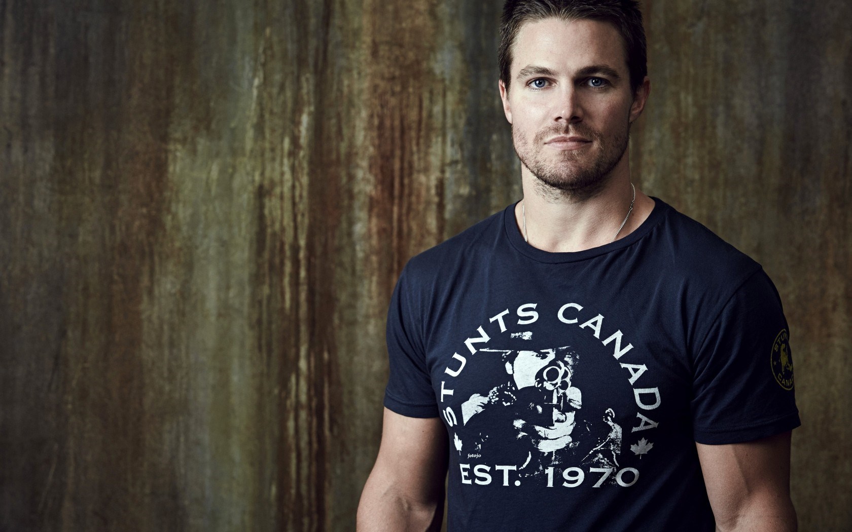 Description: A man in a black shirt is posing for a picture with a rusty background and a wall behind him.