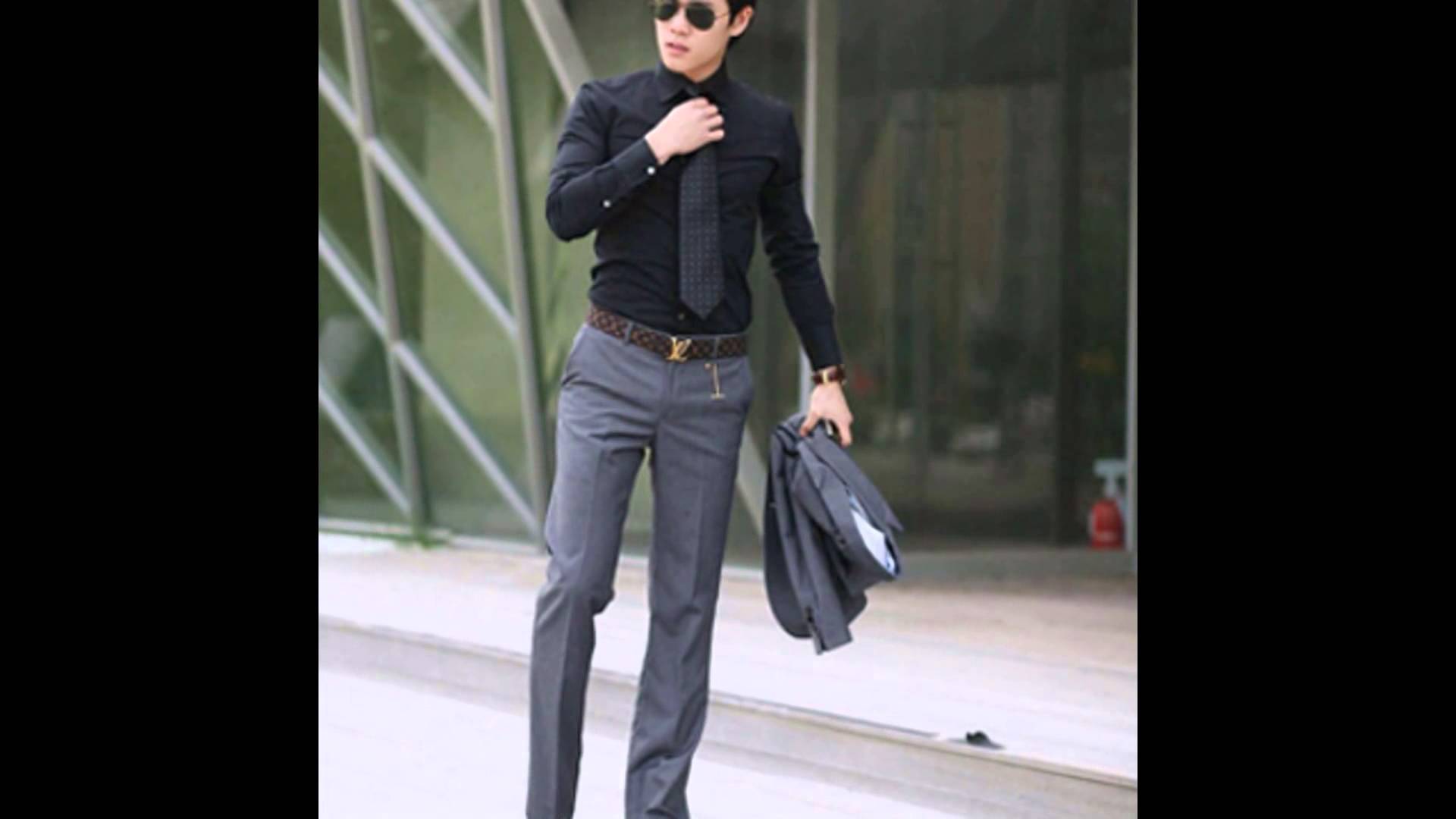 Description: A man in a black shirt and tie holding a suit case and a bag walking down a street with a handbag.