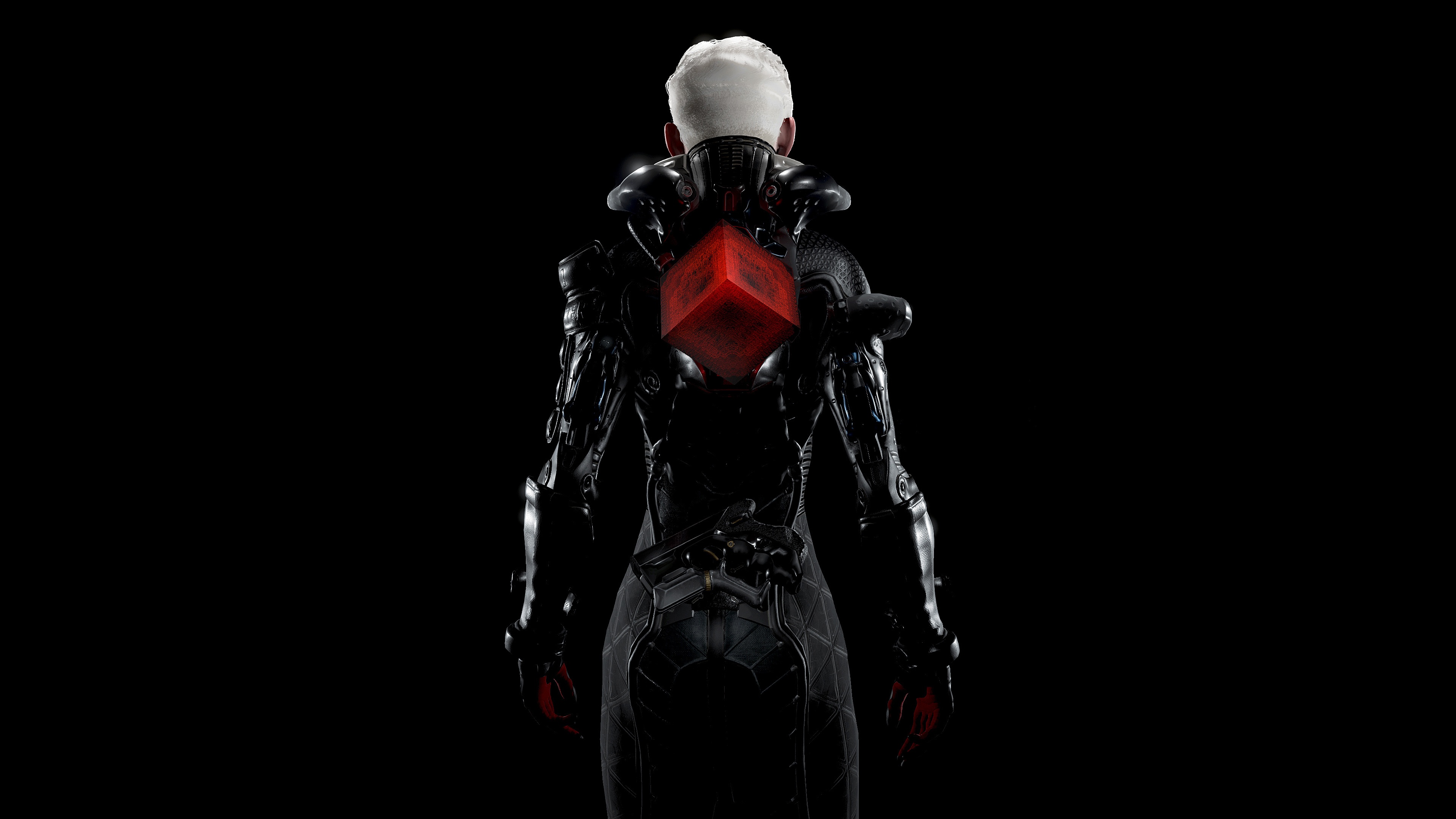 Description: A man in a black suit with a red diamond on his chest and a white hair and nose.