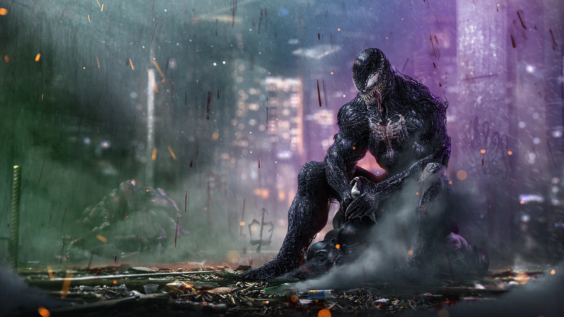 Description: A man in a black suit sitting on a rock in the rain with a city in the background and a purple and green background.