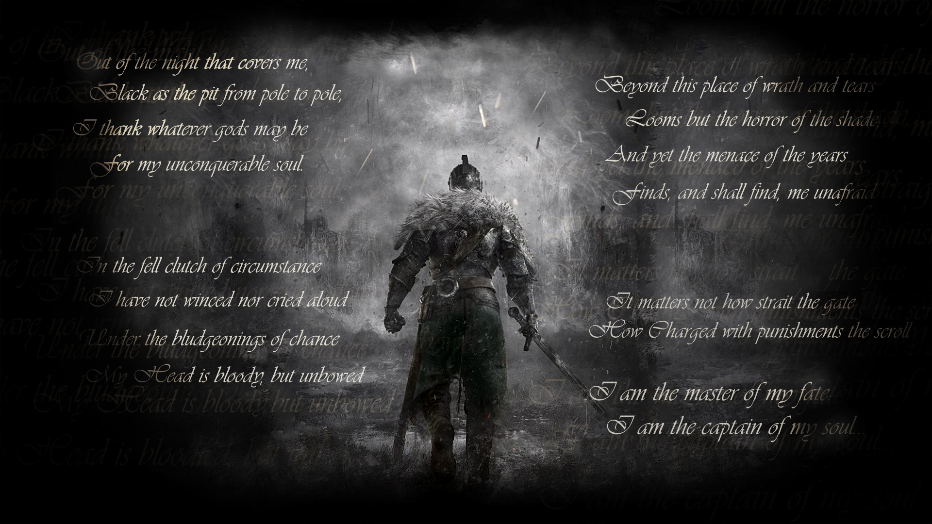 Description: A man in a black suit with a sword in his hand and a poem written in the background on a black background.