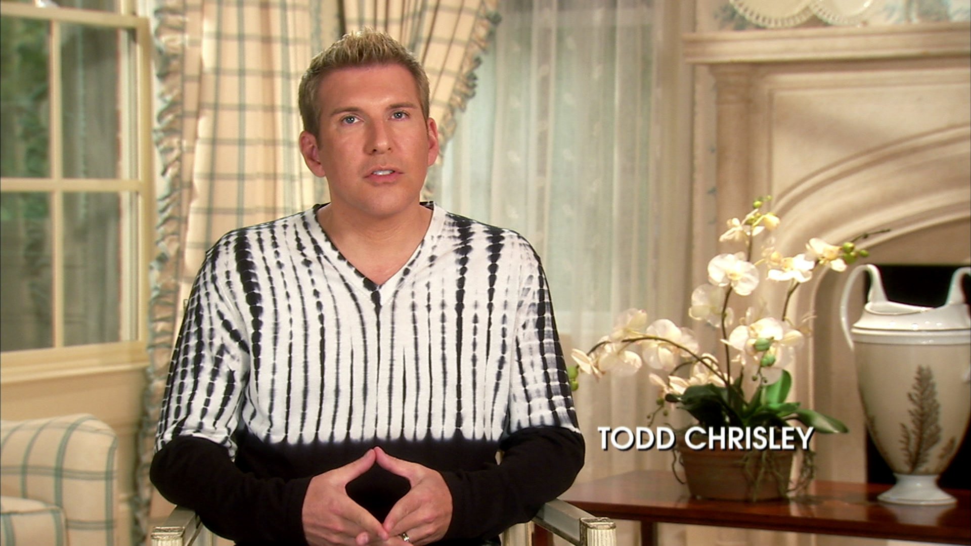 Description: A man in a black and white shirt is sitting in a chair and is looking at the camera with a serious look on his face.