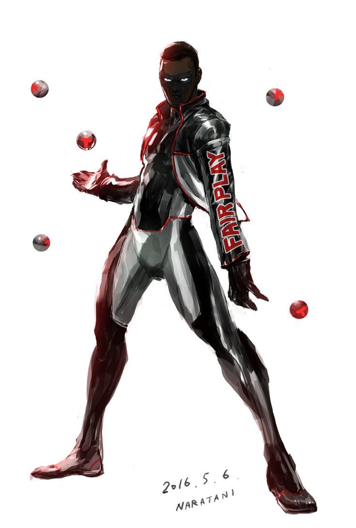 Description: A drawing of a man in a black and white suit with red accents and a red helmet and a red and white background.